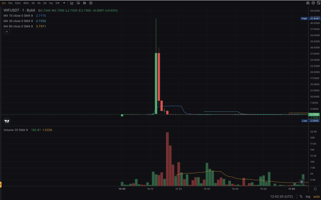 De prijs van Dogwifhat (WIF), een mememunt, ervoer een korte maar opmerkelijke piek op de crypto beurs Bybit kort nadat het daar genoteerd werd. De handel in de token begon om 8:50 a.m. ET, en iets meer dan 10 minuten later steeg de prijs van $2,70 naar een hoogtepunt van $41,85 dollar.