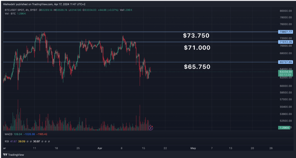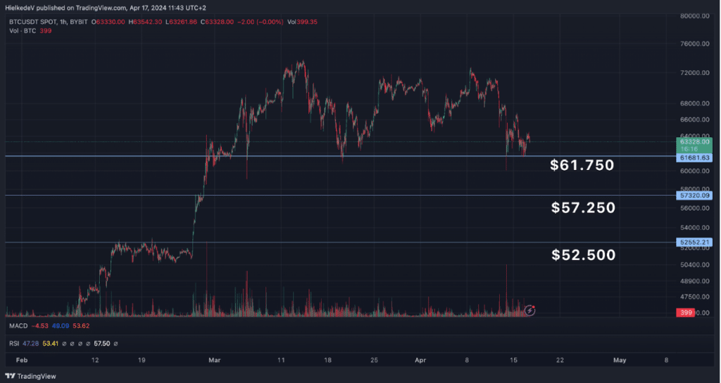 Op de $61.750 ligt een sterk support level, die al meerdere keren als support heeft weten te fungeren.
