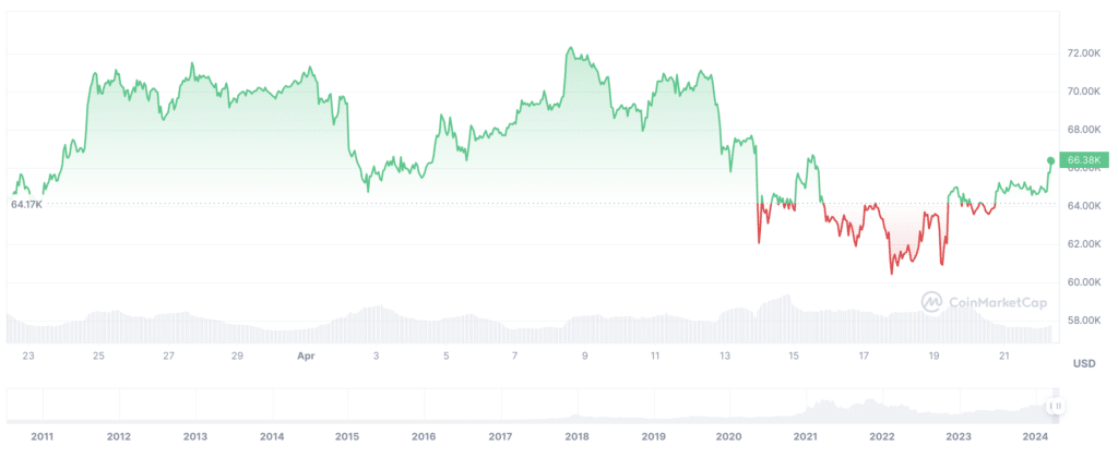 Met de halving lijkt ook de rust weer teruggekeerd op de beurs, in ieder geval wat betreft Bitcoin. Sinds 20 april heeft de token geen grote pieken of diepe dalen meer gehad. De koers gaat zijwaarts omhoog, en staat inmiddels boven de $66.000. De stabiliteit lijkt dankzij de halving teruggekeerd.