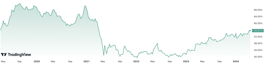 De dominantie van Bitcoin (BTC) in de crypto markt heeft een piek bereikt die de afgelopen drie jaar niet is gezien, met een marktaandeel van 56,3%. Deze toename kwam te midden van een daling van de altcoin prijzen, die aanzienlijk meer onder druk stonden dan Bitcoin zelf.