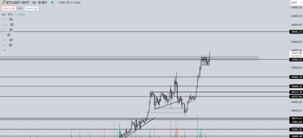 De grootste cryptocurrency qua marktkapitalisatie wist uit zijn handelskanaal te breken en bereikte tijdens de ochtendhandel in de Verenigde Staten een piek van $53.600, volgens gegevens van ByBit.