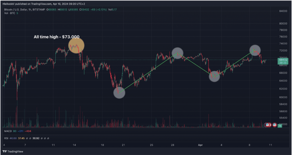Op 14 maart zette de Bitcoin koers een nieuwe all time high neer, waarna een correctie plaatsvond van 17%. Sinds de low rond $60.750 heeft Bitcoin een stijging weten neer te zetten van 18% richting $71.500.