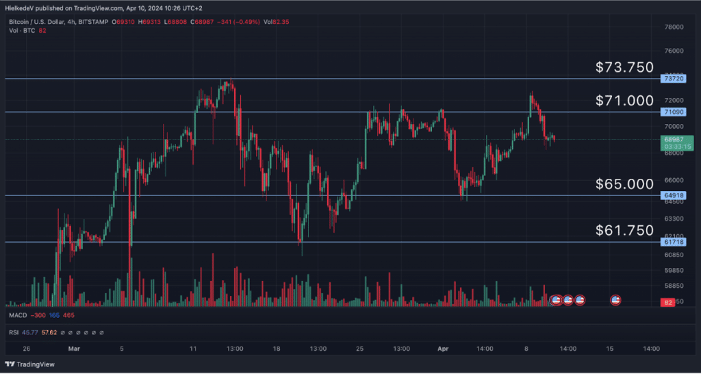 Het tweede resistance level ligt rond $73.750, waar ook de all time high zich bevindt. Het is waarschijnlijk dat de koers zich richting dit level beweegt.