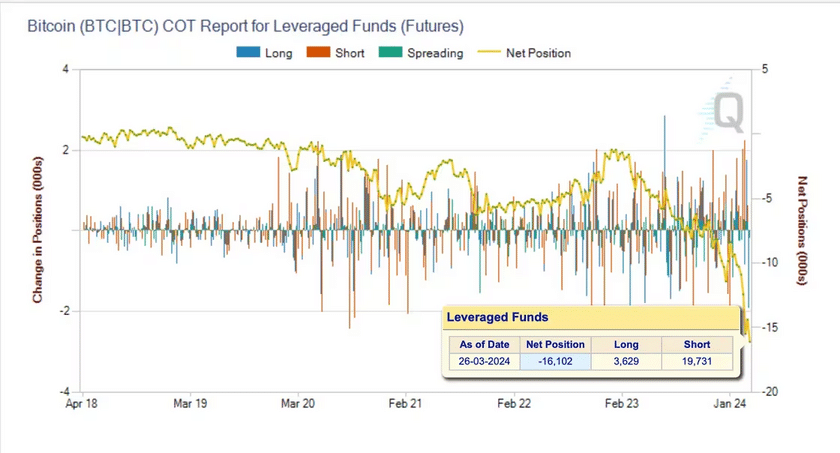 Een opvallend fenomeen is de recordhoeveelheid aan shortposities die momenteel zijn vastgelegd op de Chicago Mercantile Exchange (CME) in de Verenigde Staten. Met maar liefst 16.102 openstaande shortposities, een niveau niet gezien sinds eind 2017, wordt er gespeculeerd op een neerwaartse trend voor Bitcoin. Deze shortposities, significant vanwege de grote waarde van elk contract – 5 Bitcoin – impliceren dat er ongeveer 80.000 Bitcoin in het spel zijn door deze speculatieve activiteiten.