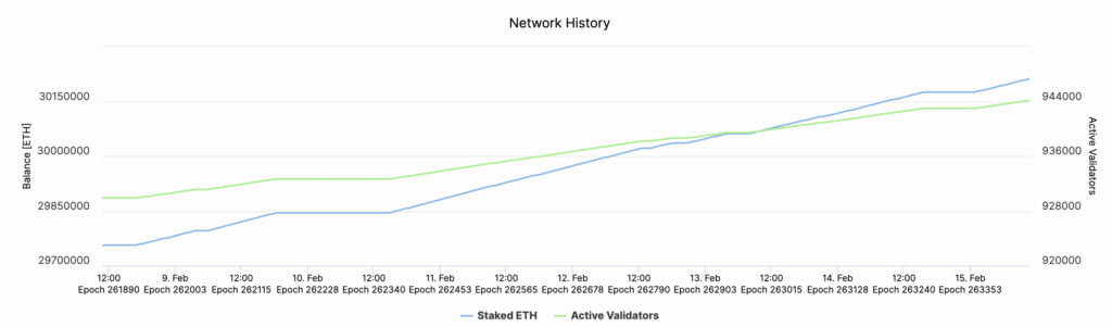 Opvallend is dat bijna 25% van de totale circulerende voorraad Ethereum, wat overeenkomt met 30.206.801 ETH met een waarde van meer dan $85 miljard dollar, nu vastgezet is in de Beacon Chain via stakingscontracten. Dit wordt ondersteund door bijna 944.000 actieve validators, wat de veiligheid en efficiëntie van het netwerk ten goede komt.