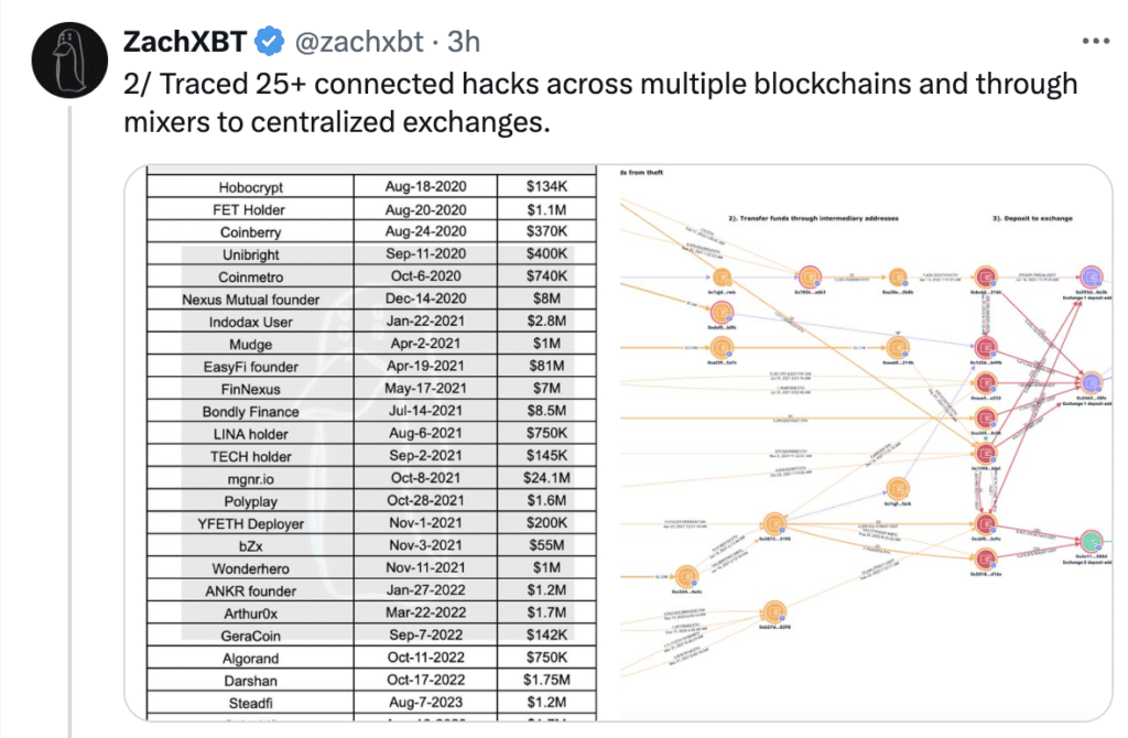 Het onderzoek van ZachXBT, dat meer dan 25 exploits op diverse blockchains omvatte, traceerde hoe illegaal verkregen fondsen via mixers, peer-to-peer marktplaatsen en gecentraliseerde beurzen werden witgewassen en uit het crypto-ecosysteem werden verwijderd.